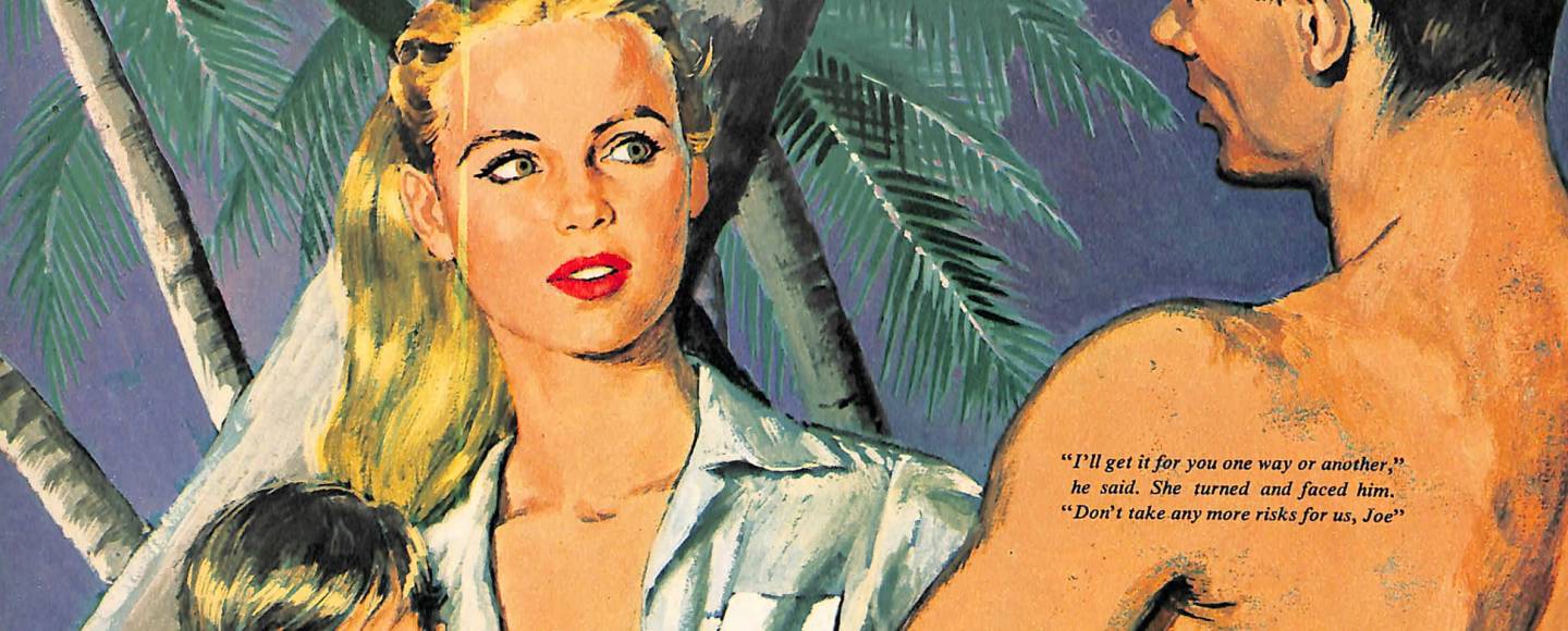 The stunning illustration from Dorothy Monet shows a pretty blonde woman holding a baby talking to a dark haired man in an island setting.