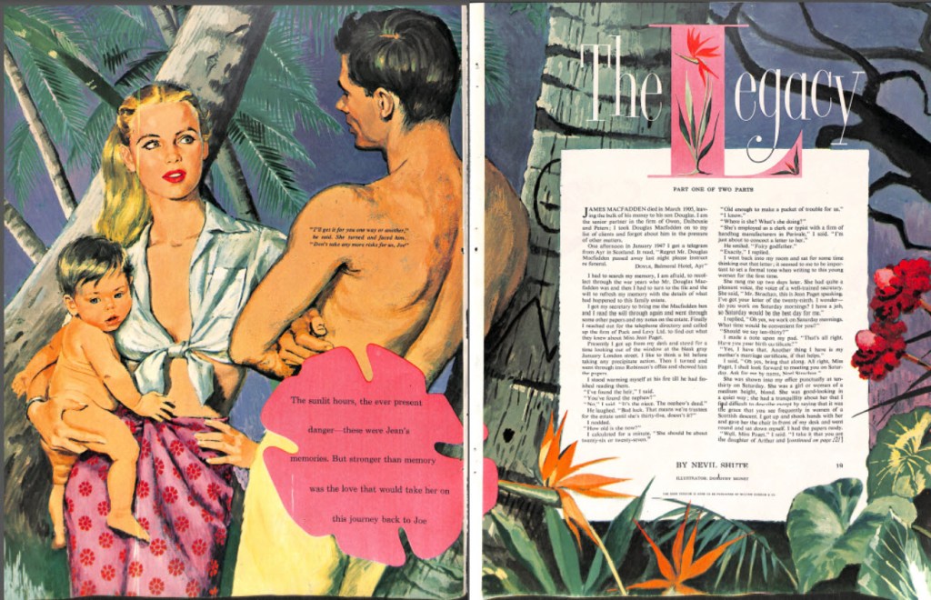 This 13 page short story was published in the April 1950 issue of Woman’s Home Companion. It was written by Nevil Shute with a two page illustration by Dorothy Monet. The magazine published this as a two part serial. This was the first part, but there was no mention of when the 2nd part would be published, likely in the next issue. According to the magazine, the book version was to to be published soon by William Morrow & Co.