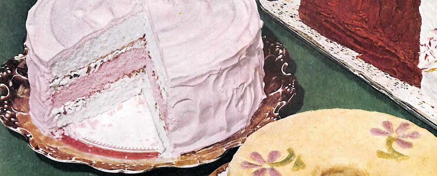 What would a mid-century woman’s magazine be without a recipe or two? Many of the recipes I’ve collected from these old pages are nothing short of disgusting. This one, however, is quite clever with delicious possibilities. It contains the following cake recipes.