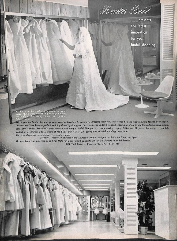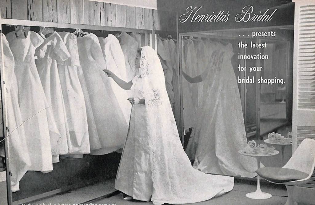 This full page black and white ad for Henrietta’s Bridal caught my eye when browsing through the pages of the June 1964 edition of Bride & Home magazine. I was reminded that the thrill of bridal dress shopping has not changed during the near 6 decades since this ad was released.