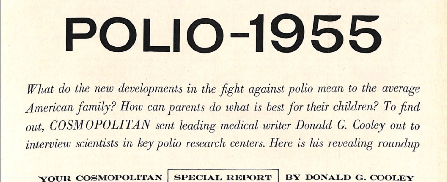 This article from the May 1955 edition of Cosmopolitan magazine is written as a question and answer interview with the leading infectious disease scientists from the day. The subject is sad and scary as the reader expands her understanding of the devastating disease named Polio and increases her understanding of its vaccine. Here the fear is heightened since the reader is likely a mother concerned about her children. The article cites that 80% of adults have been infected by polio, but generally suffer no harm. Those most likely to suffer are children.