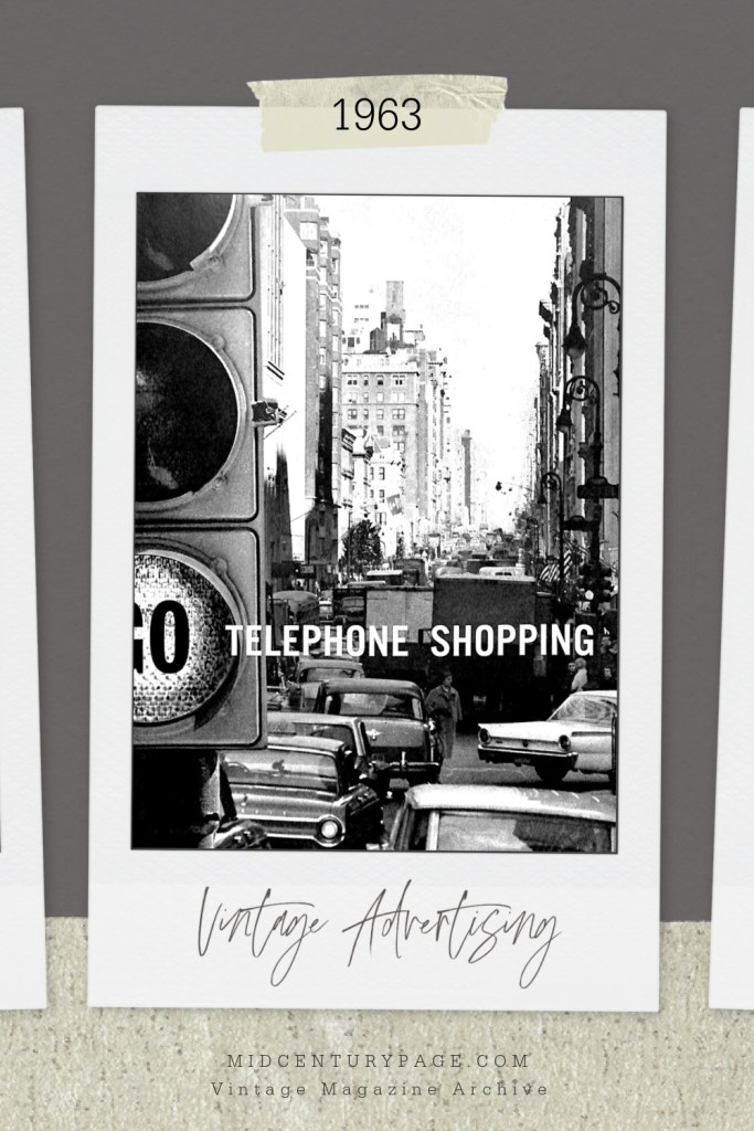 Take a look at this 1963 Bell Telephone System ad. It reminds Good Housekeeping readers that they can use the phone before they shop. This fun black and white ad shows a hectic big city street scene filled with cars that will be sought-after classics 60 years later.