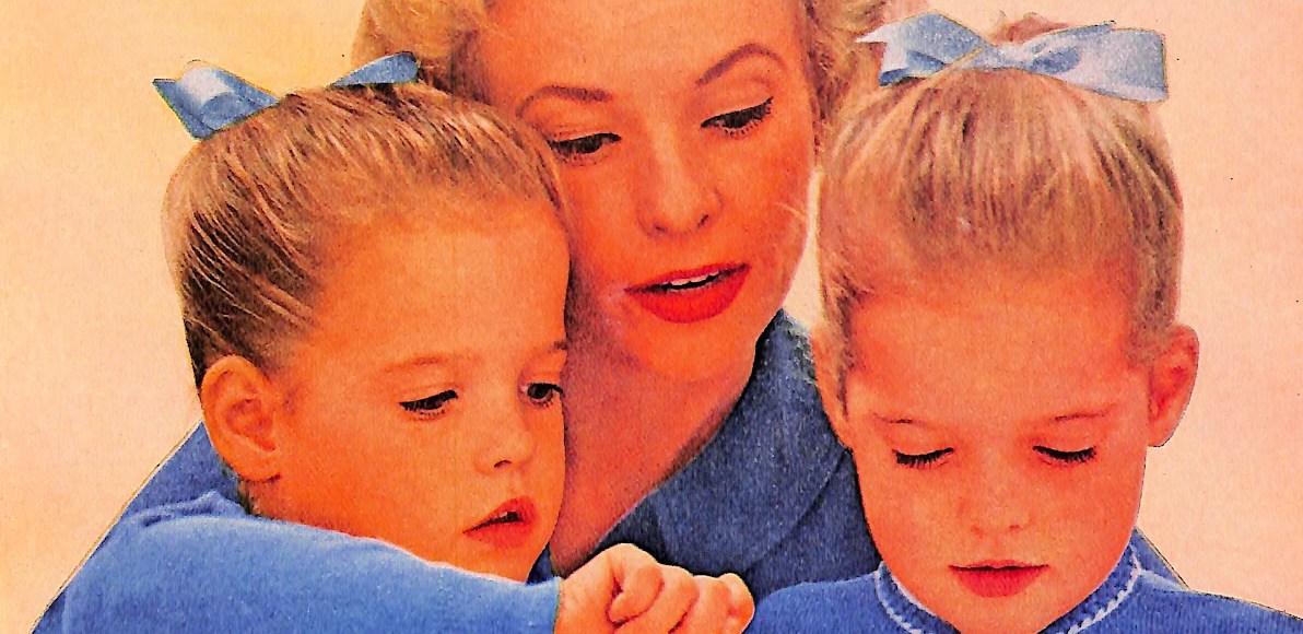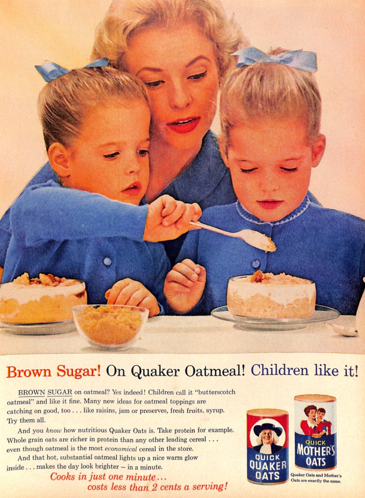 This ad for Quaker Oats captures the sweetness of mid-century mornings with a bowl of oatmeal served special with brown sugar. The sweetness continues with the matching sister hair bows and matching mommy daughter outfits. Food ads like this were typical for Good Housekeeping magazine (this one appeared in the November 1963 edition). I found that Good Housekeeping was a step up from similar homemaker magazines which catered to the stay at home moms. The magazine still exists today.