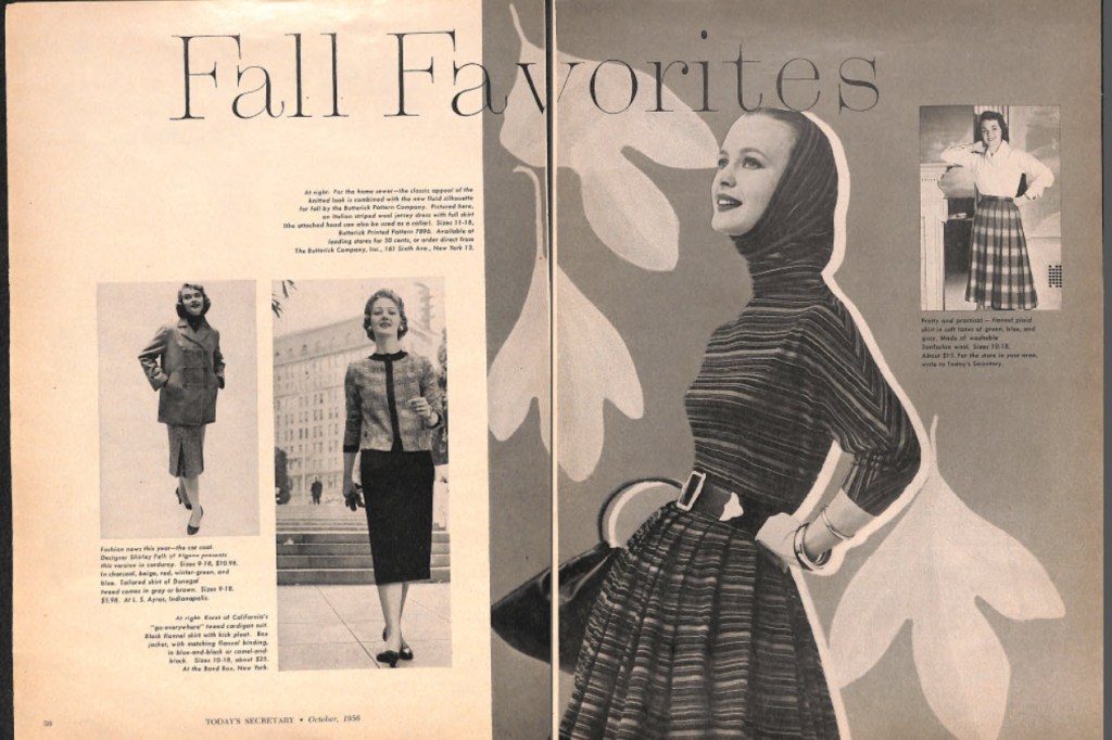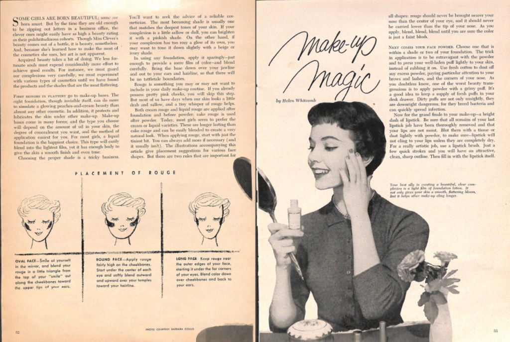 I was able to acquire a few editions of a magazine created specifically for mid-century office workers titled Today’s Secretary. Although it is not as interesting as a fashion or homemaker magazine, it does give us a peek into life as a secretary. Here is an excerpt from the Good Looks section of the October 1956 edition. It gives tips on how to apply makeup. Other information included in this section includes fashion advice.