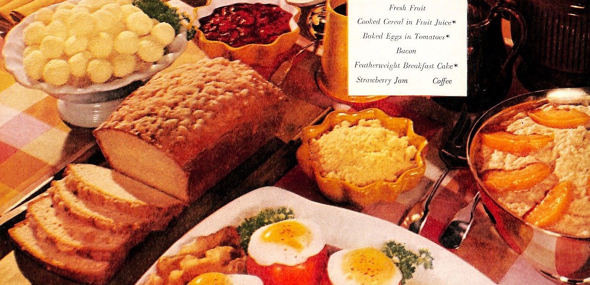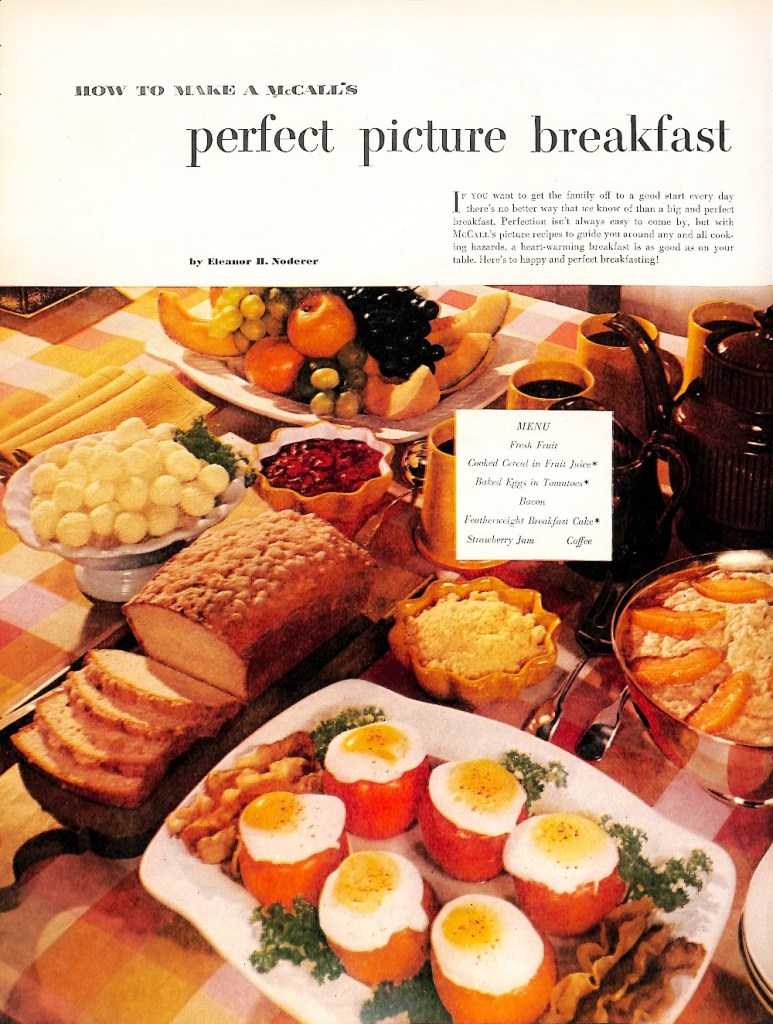 The size and complexity of this mid-century breakfast makes me laugh. Imagine waking up to this kind of feast every morning. Or–imagine being the one who has to prepare it.
