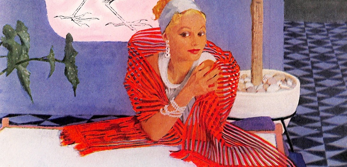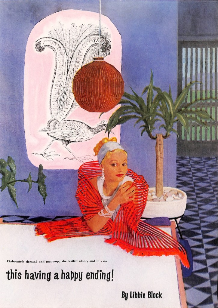 Good Housekeeping magazine supplied their readers with two or more short stories in with each mid-century edition. This one from February 1955 titled, “Cats Know Who Hate Them” by Libbie Block featured this striking illustration by Al Parker. We see a pretty blonde women wearing a red shawl and white head band sitting in a room furnished with mid-century modern decor. Magazine illustrators were limited in the number of colors they could use. The lines, shapes and contrasting colors that Parker used in this illustration are pleasing to the eye.