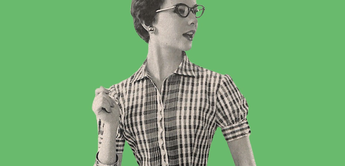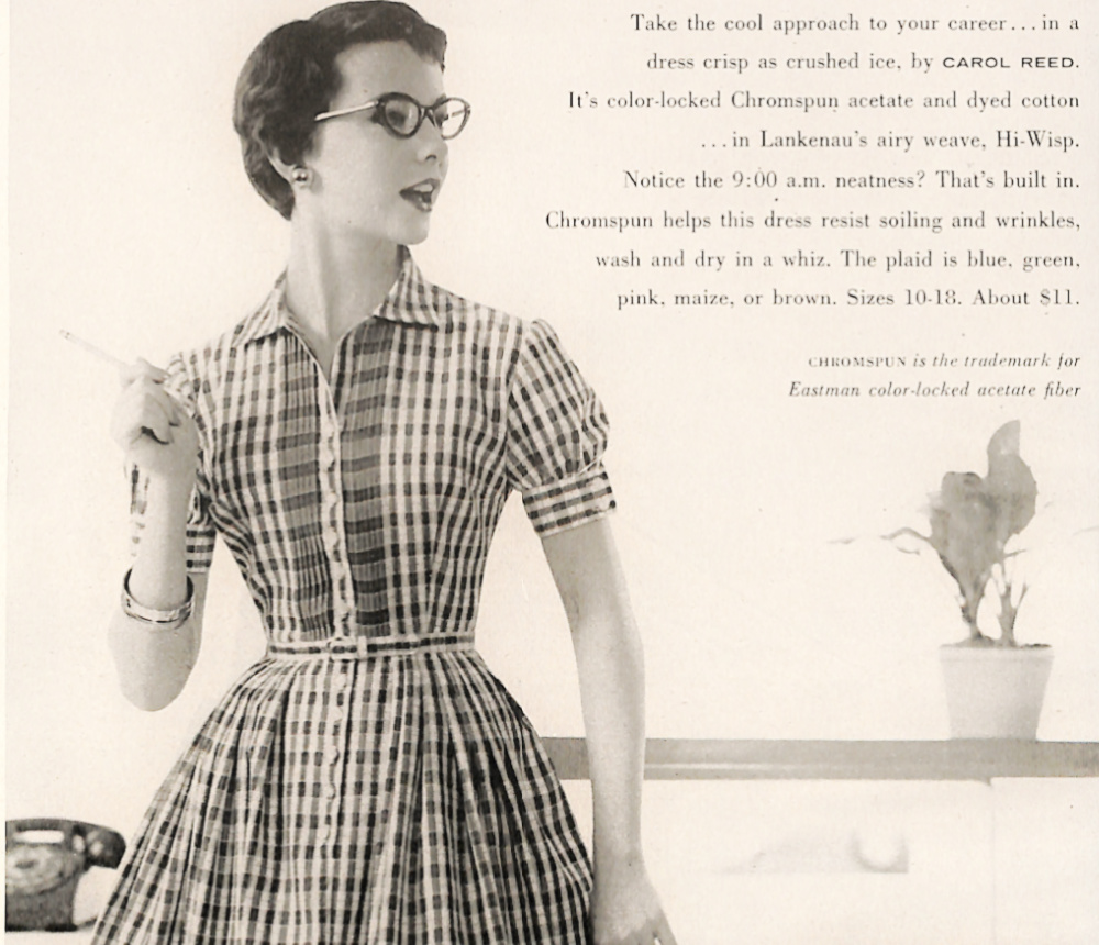 This fun fifties shirtwaist dress from Carol Reed is brought to us by Eastman Chemical Products company (a division of Eastman Kodak). This wrinkle and soil resistant fabric called Chromspun uses a combination of cotton and acetate. The plaid fabric came in blue, green, pink, maize, and brown. The dress was designed and produced by Carol Reed and sold for about $11.00 at Bloomingdales.