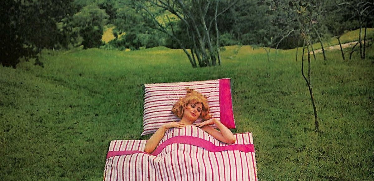 This ad for Springmaid sheets showing a 1960’s woman with blonde hair waking up in a green meadow appeared in the August 1963 Good Housekeeping. Printed sheets such this candy-cane stripe were a fun concept for mid-century women wanting to perk-up a bedroom.