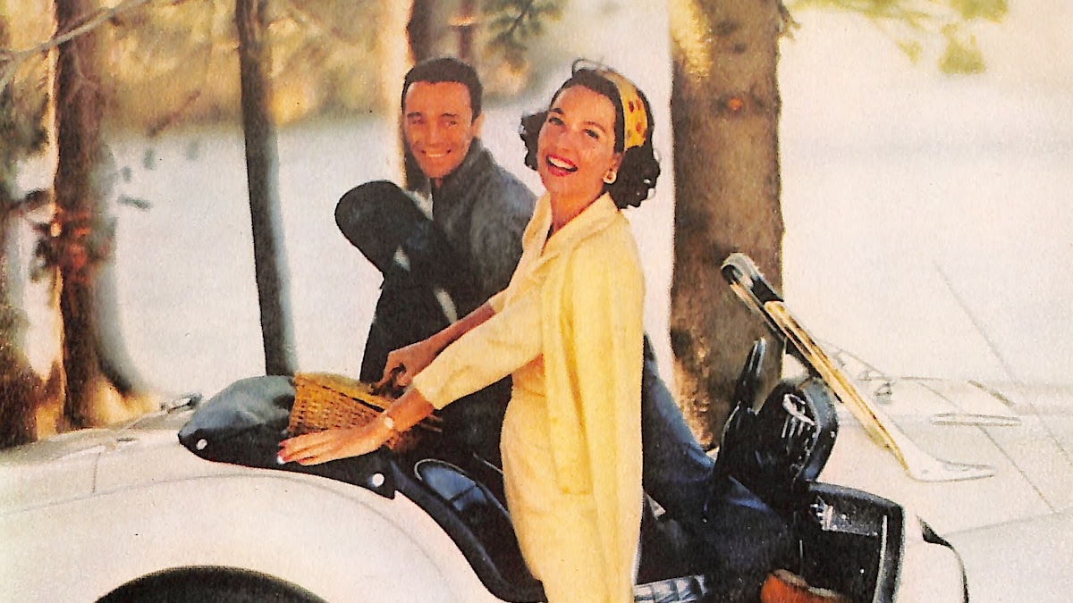 In a 1959 ad, a couple enjoys a picnic by a lake, highlighting Fems Feminine Napkins and a vintage Ferrari’s timeless appeal.