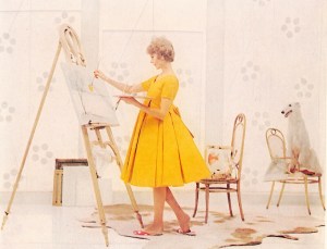 A pregnant woman wearing a fabulous yellow maternity dress is painting a picture in a soon-to-be nursery.