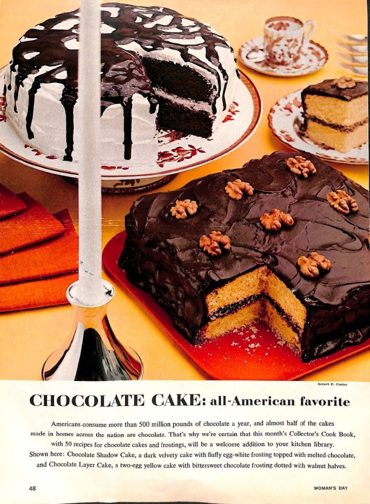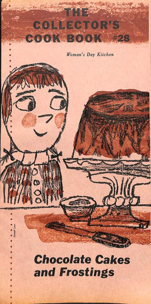 Woman’s Day magazine would include a small glue-bound recipe book inside their mid-century magazines. These “Collector’s Cookbooks” could be clipped out of the magazine for easy storage. Here we have Collector’s Cookbook #28 from their May 1959 issue. It includes dozens of cake and frosting recipes all made with chocolate.