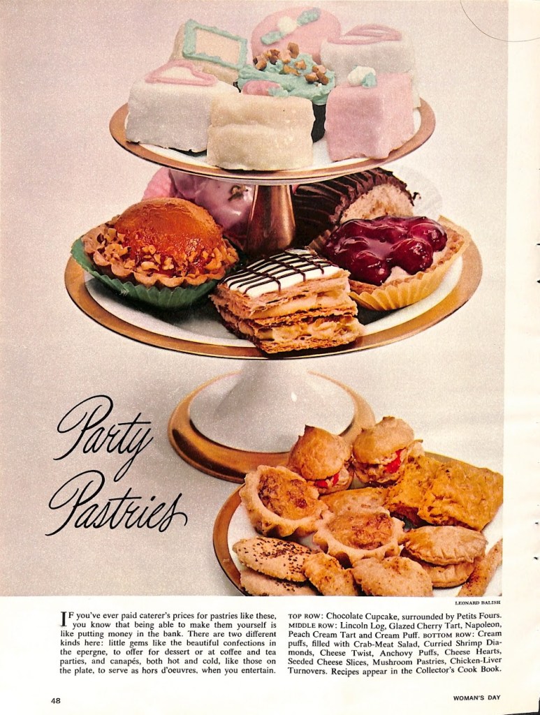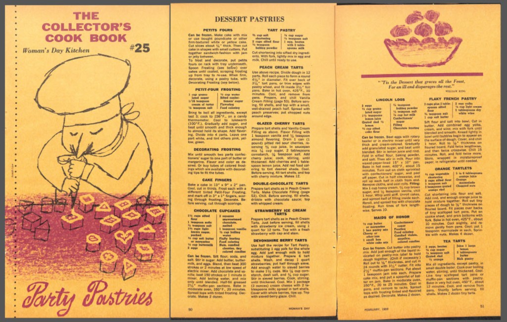 Mid-century bakers looked forward to getting their monthly issue of Woman’s Day magazine where they might find a cook book cutout. This one is from the February 1959 issue. It is titled Collectors Cook Book #25 from the Woman’s Day Kitchen. The topic? Party Pastries!