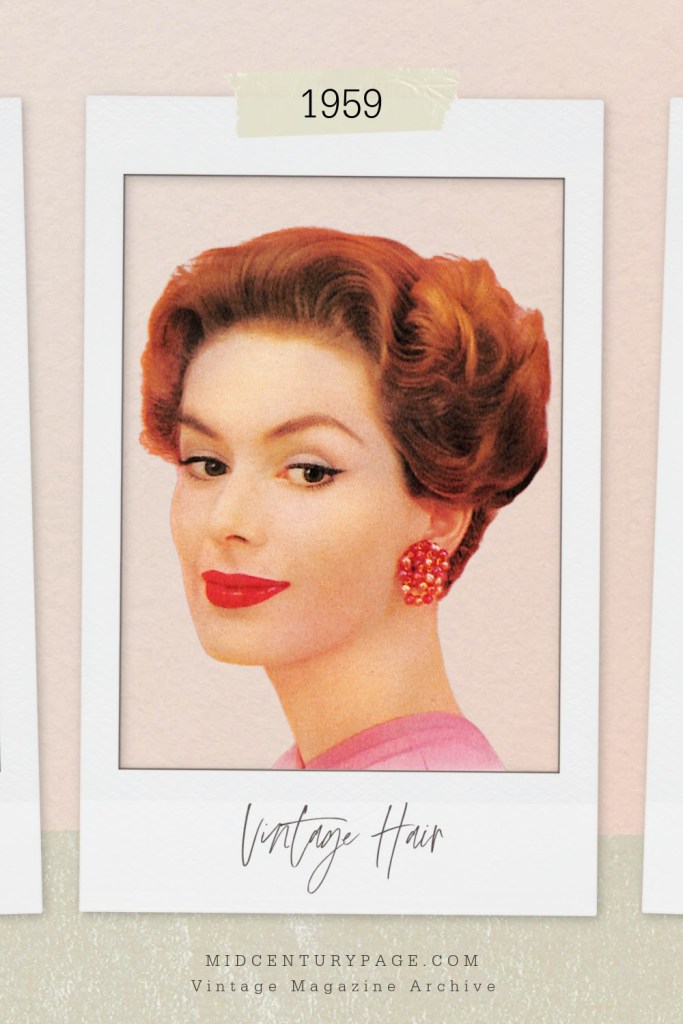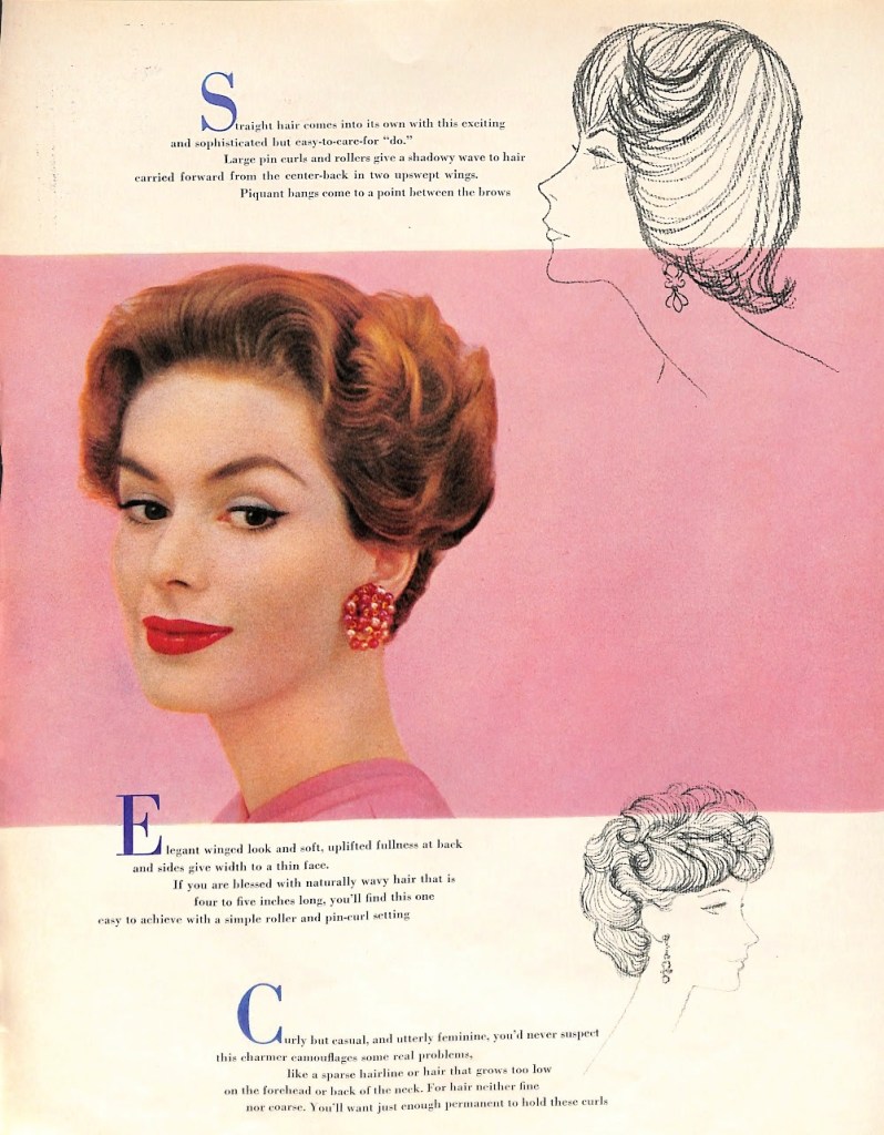 It’s funny how you can guess the era that a picture was taken by looking at someone’s hair style. The curl and length definitely speaks 50’s. The photo you see was part of an article in the March 1959 edition of McCalls magazine titled, “Nine pretty Hairdos for Spring”. They described this style as a Winged Look.