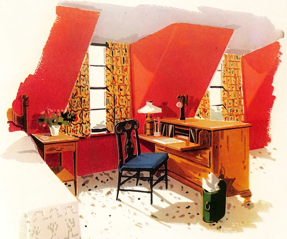His stunning illustrations were used to provide solutions for the mid-century home owner wishing to add window coverings to a variety of types of windows. They gave ideas for dormer windows, picture windows, corner windows, etc. The illustrations showed ideas for both traditional and contemporary rooms.