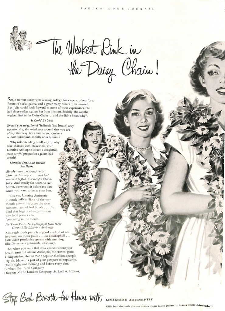 Listerine mouth wash ads seemed to be extra ruthless in mid-century woman’s magazines. Apparently the goal was to shame the reader and make her feel like she should either use Listerine or be an outcast. This copy of this one is telling of the mid-century mindset.