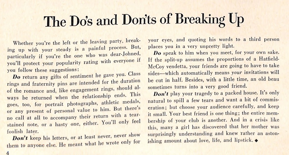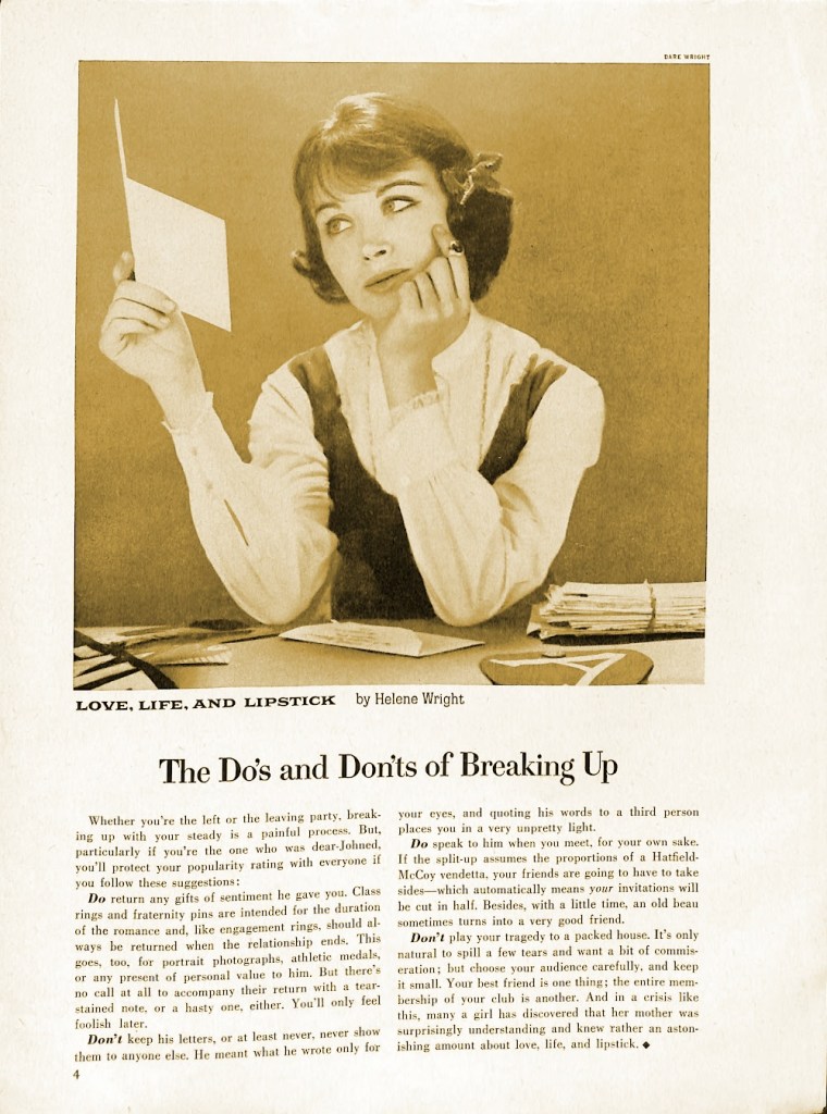 This article from the March 1959 edition of Good Housekeeping magazine tells us that life goes on–even with a break-up.