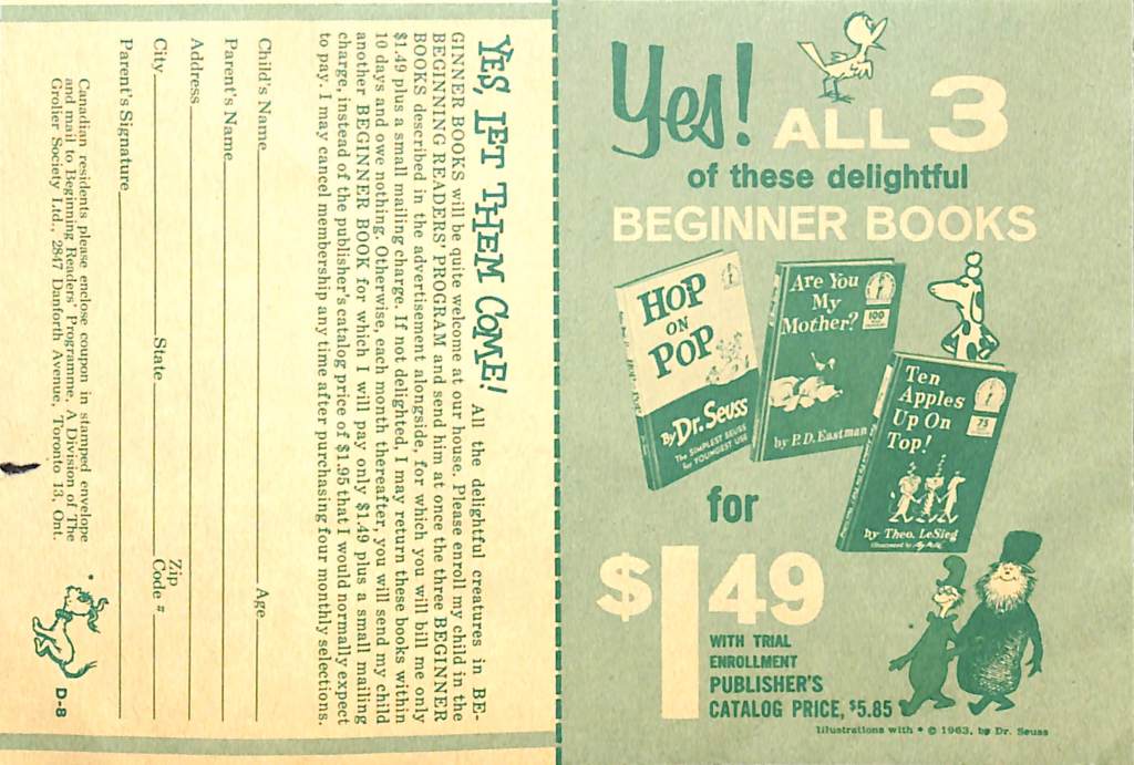 The program was for early readers, and not for only Dr Seuss books. It makes sense, however, that it would be branded as Dr Seuss. By 1964, his name was a household word and the Dr Seuss brand was an American institution. Classics such as Green Eggs and Ham and Cat in the Hat were published almost a decade prior. The classic Christmas movie How the Grinch Stole Christmas was released in 1966.