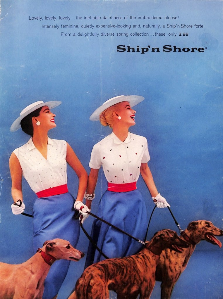 Of course, the ad you see is about clothing and not pups. The ad for Ship ‘n Shore is showing off their $3.98 embroidered blouse. It appeared in the March 1956 edition of Glamour magazine. The look is complete with a hat, earrings, belt, bracelet, gloves and 3 cool looking dogs. Where do they keep the doggie treats?