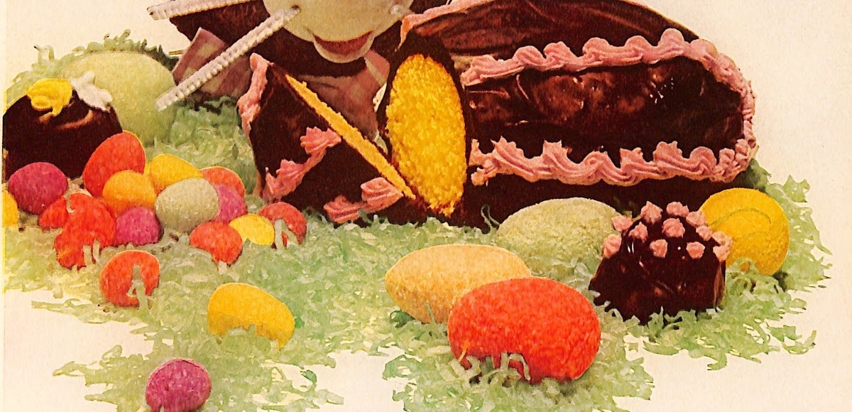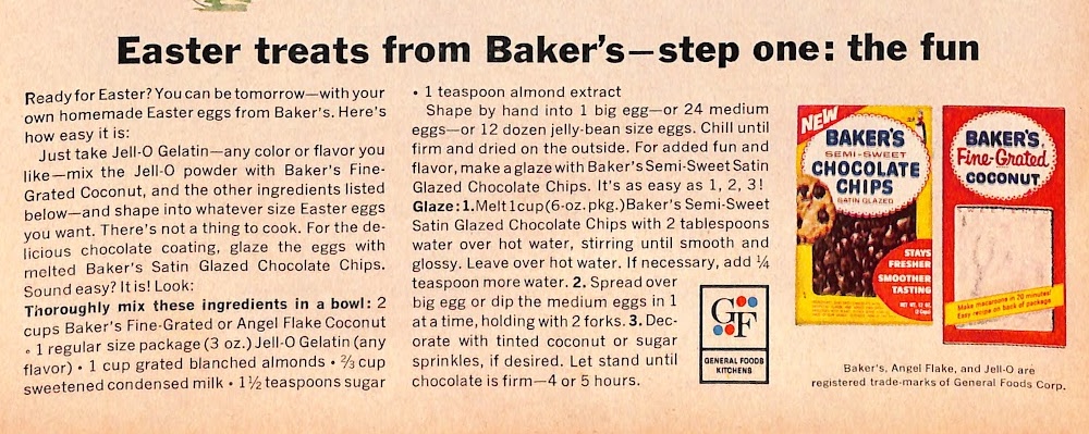 I wonder how many mid-century makers browsing through the April 1963 edition of Good Housekeeping magazine saw this ad and decided to try the recipe. The recipe is actually for the Easter eggs, and not the egg-shaped cake. To make the eggs, you mix coconut, jello, almonds, sweetened condensed milk, and sugar; form into an egg shape and then chill until firm. To decorate, add tinted sugar or a chocolate glaze. I hope it worked for the ambitious baker who decided to try it. Perhaps its my 21st century pessimism talking, but it seems like a bad idea.