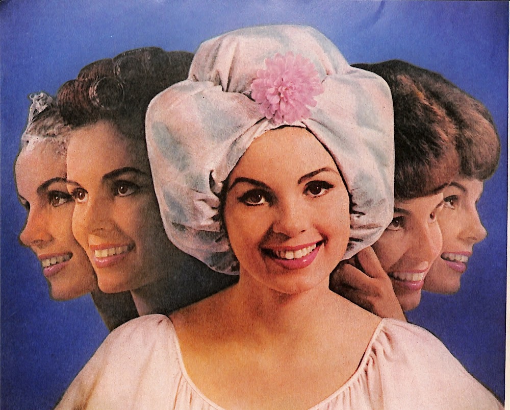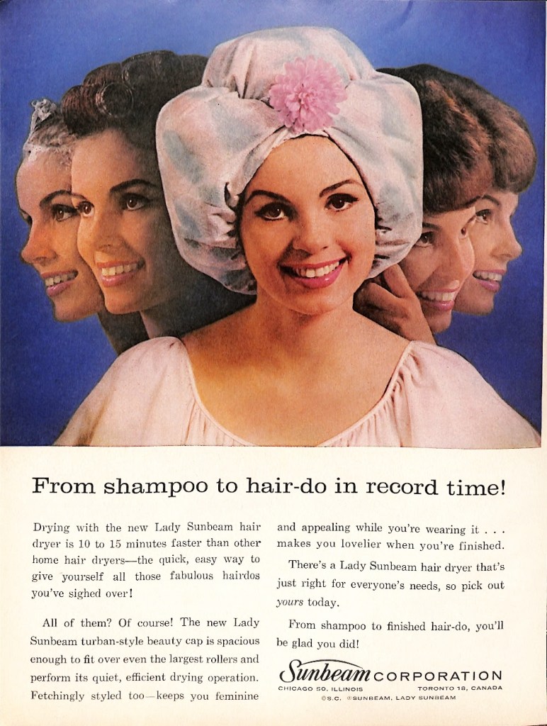 Let’s file this one under extinct. It joins pointy bras, girdles, white gloves and tiny waistlines as artifacts from the past. Like it or not, these mid-century female necessities are buried in a time capsule never to return. The woman you see is wearing a portable hair dryer. It hooks on the back to a tube that sends warm air to the head from an appliance made to dry hair. The product for this ad is called the Lady Sunbeam. It is styled with a flower and feminine colors because you wouldn’t want to look ridiculous wearing it.