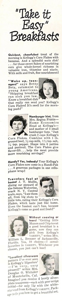 The ad also has a list of endorsements from mid-century professionals disguised to look like text from the magazine instead of more words from Kellogg’s. How tricky.