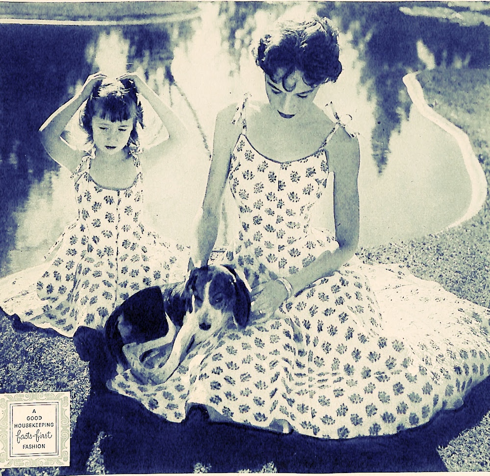 The charming picture of a mother and daughter wearing matching sundresses that you see was part of a fashion article in the June 1954 edition of Good Housekeeping magazine called Cool Cottons for You and Yours.