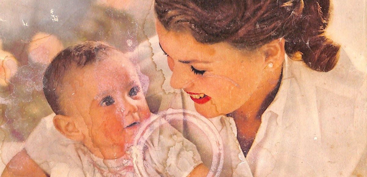 Let’s continue our look at mid-century moms with this stained and worn magazine cover from the March 1957 issue of Woman’s Day magazine. True, it features a picture of an adorable baby and his mom, but the part I like best about this picture is the patina. The coffee cup ring and accompanying imperfections give it character. The abused magazine cover has lasted 65 years. The same is hopefully true for the baby and mom who are now 65 years older. Age is beautiful.
