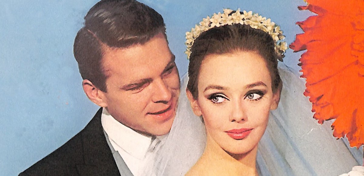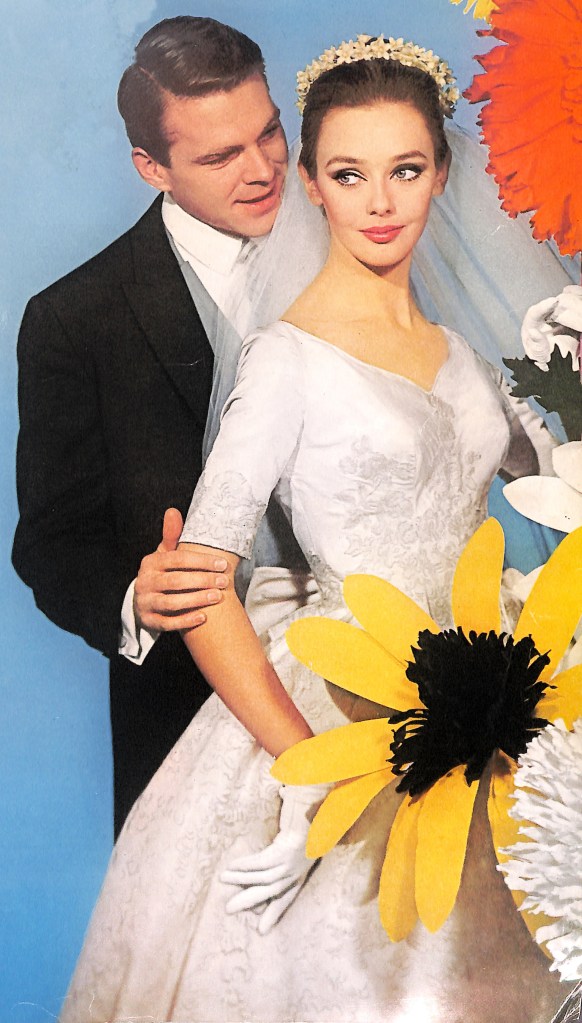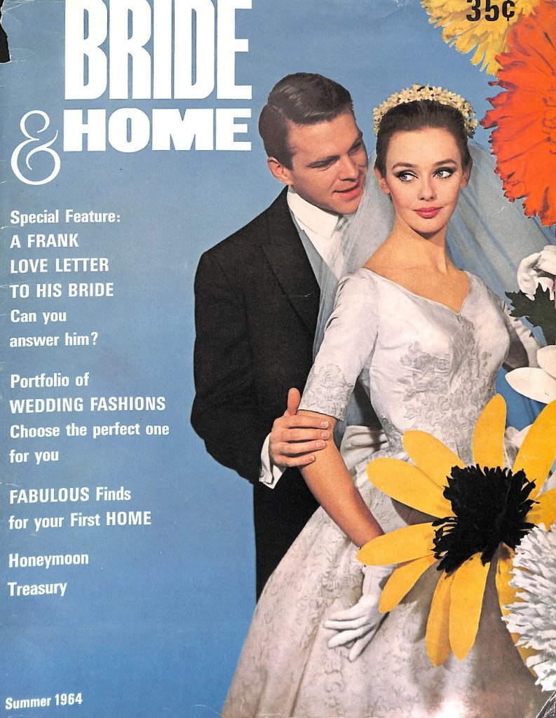 While flipping through the pages of my mid-century women’s magazines, I often wonder about the person who bought the magazine originally. Let’s assume that the bride-to-be who bought this 1964 summer edition of the Bride & Home magazine did so with curiosity and excitement. The cover shows a bride and groom with the look of perfection. Each possess a classic look and attractive charm that is pleasant to look at. The editors took it a step further and added unexpected gigantic flowers to the mix. It is perhaps a nod to the yet-to-be flower power movement that would define the sixties.