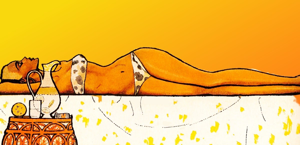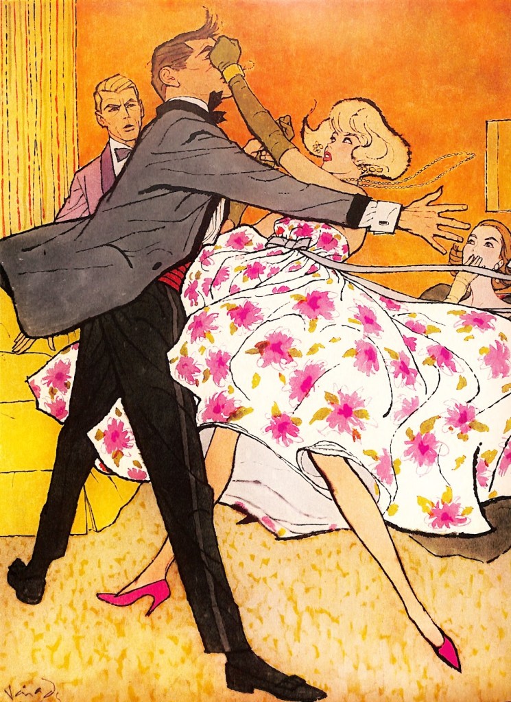 This illustration by Frederic Varady was published in the February 1959 edition of Cosmopolitan magazine. It accompanied a 6 page short story by MacDonald Harris titled Scar of Love. The talents of both the author and illustrator are obvious in this piece. Here’s a bit of the text.