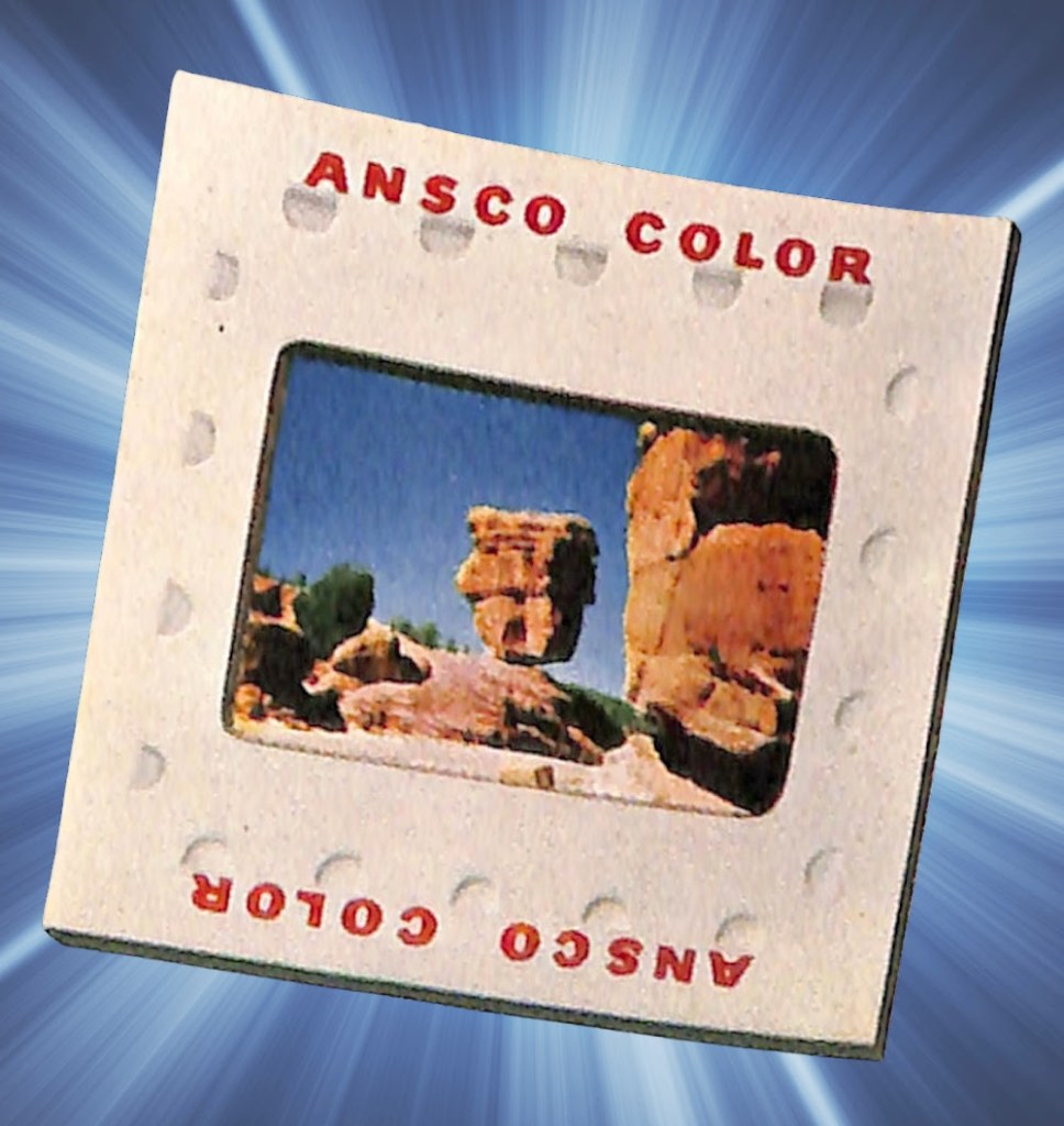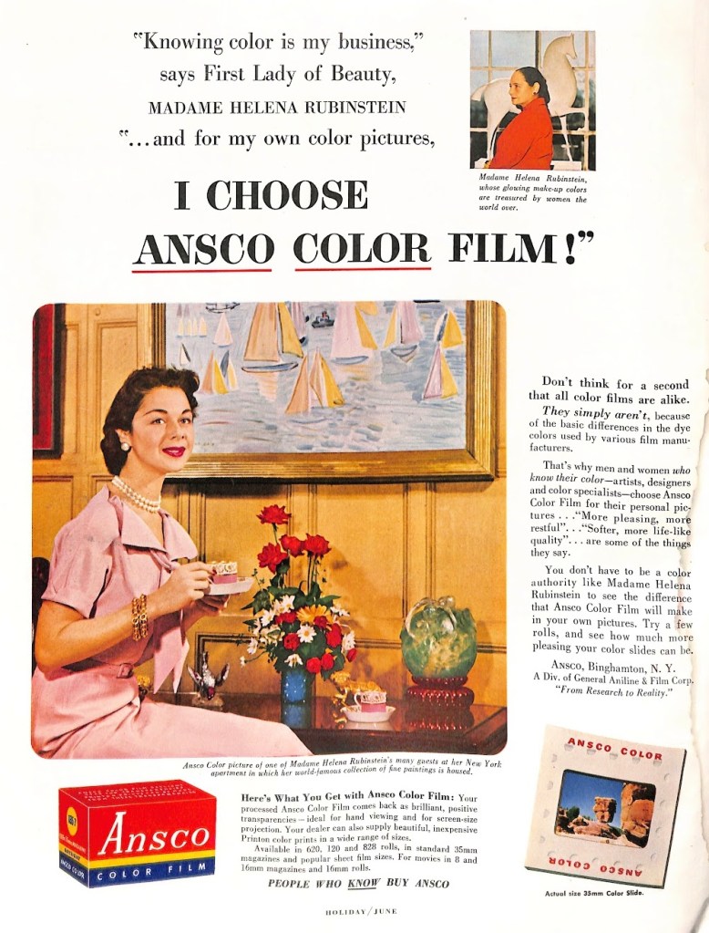 This ad for Ansco film from the June 1954 edition of Traveler magazine reminds us of the significant changes to photography since the mid-century. Looking through scrapbooks of family photos during this timeframe, I only see black and white photos. It isn’t until the next decade that I start to see color photos. This tells me that this ad is targeted to professionals or serious hobbyists.