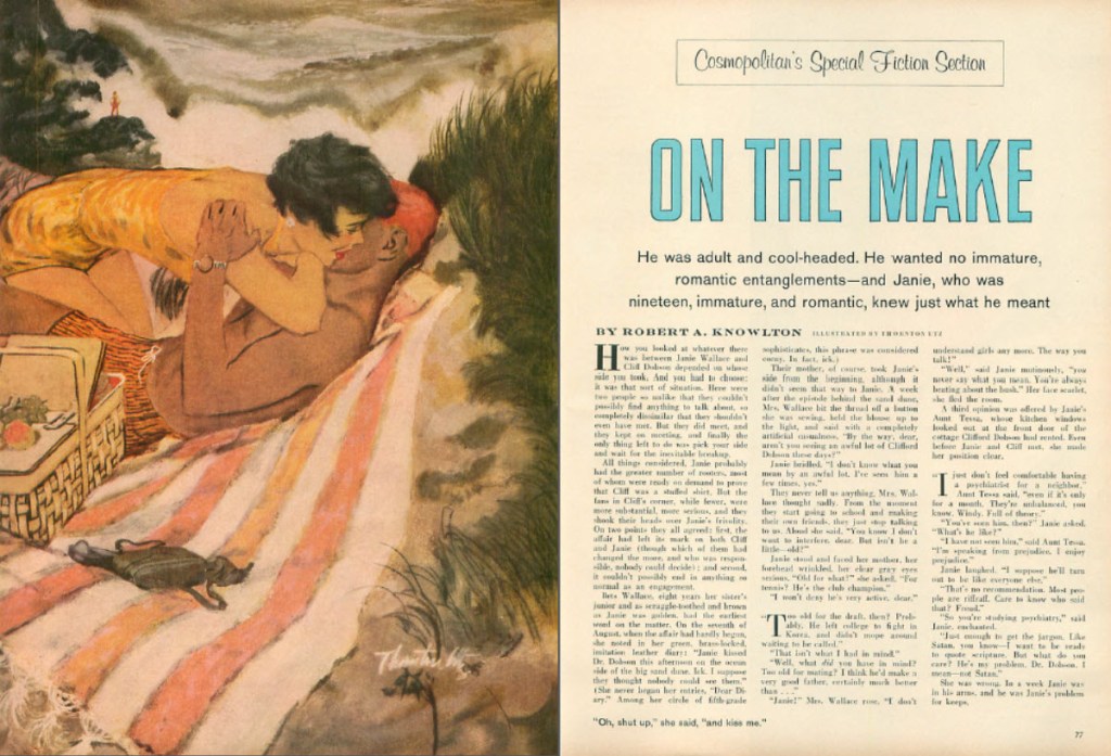We continue our deep dive into mid-century summers with this illustration by Thornton Utz. It accompanied a 5 page short story by Robert A Knowlton titled “On the Make”. The illustration shows a couple in swimwear, a striped beach blanket, and a picnic basket. A small figure in the distance appears to be observing the couple’s embrace.