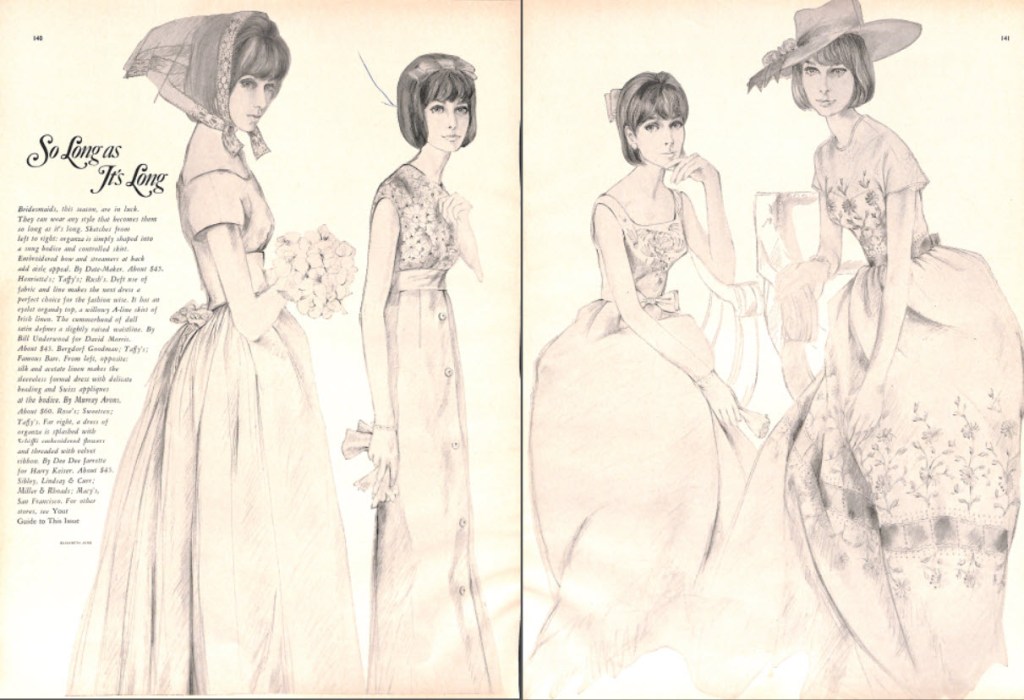 This 2 page article from the June 1964 edition of Bride and Home gave advice for the bride selecting dresses for her bridesmaids.