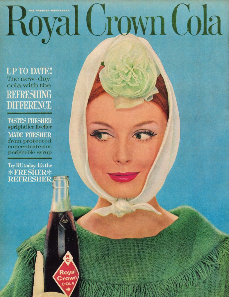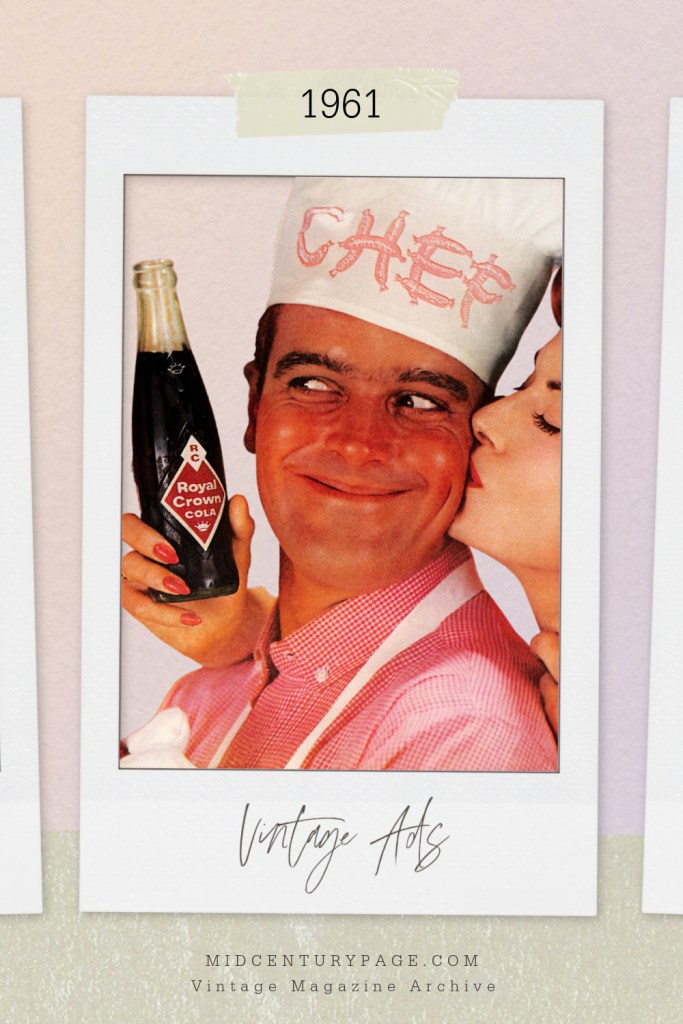 This hot dog chef doesn’t seem to mind the kiss or the cola. Although clearly 3rd place behind Coke and Pepsi in the cola wars, RC Cola was a popular choice in the early 1960’s when this ad was published in the September 1961 issue of McCalls magazine. Here are 2 more Royal Crown Cola ads from my collection.