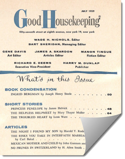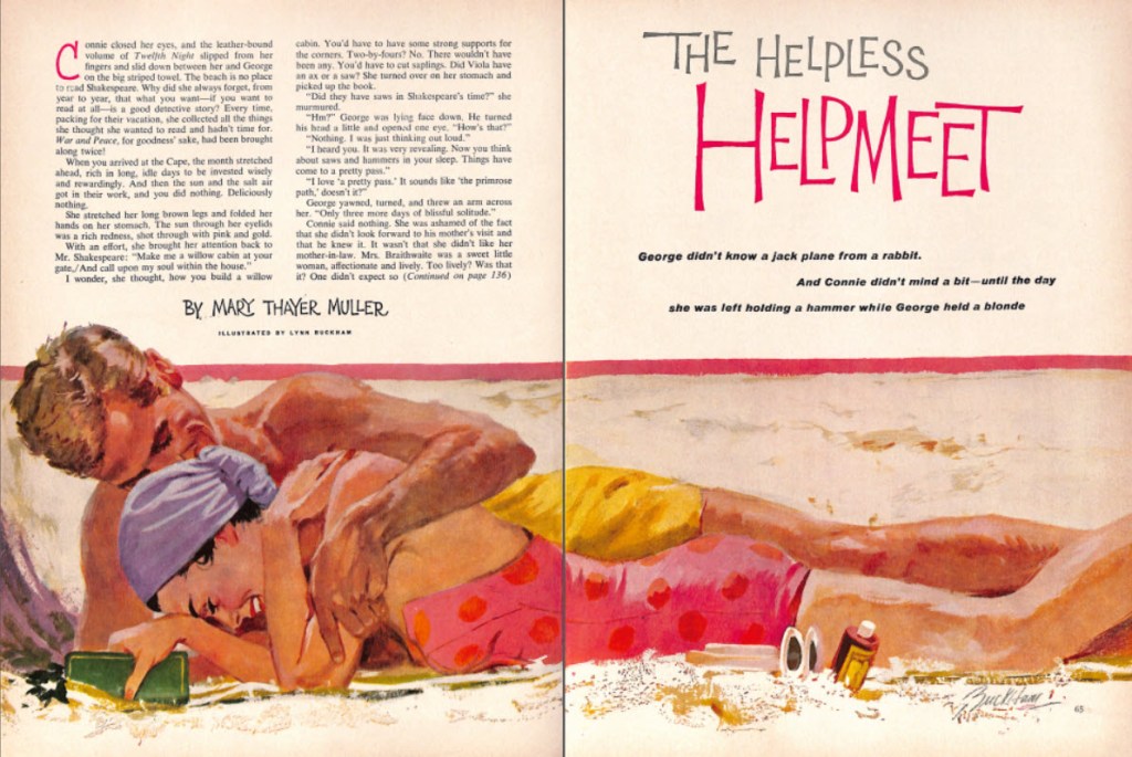 Mid-century magazine illustrations helped to define the era. This illustration by Lynn Buckham showing a couple at the beach extended 2 pages of the July 1959 edition of Good Housekeeping magazine. It accompanied a short story titled, “The Helpless Helpmeet” by Mary Thayer Muller.