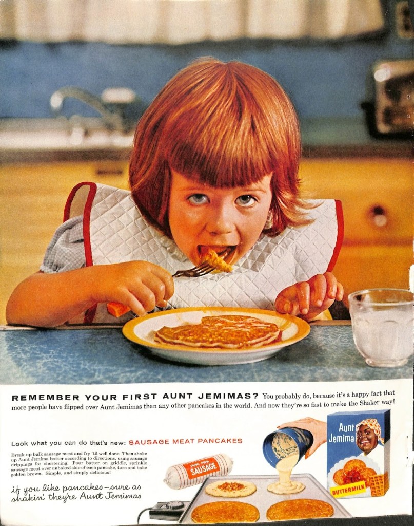 First up– Aunt Jemima pancake mix. This brand advertised in household magazines such as Good Housekeeping and Ladies Home Journal. Most of the ads found in my collection were from an ad campaign that featured children. The one you see here was from the December 1959 edition of Ladies Home Journal showing an adorable child with sticky fingers eating a plate of pancakes.