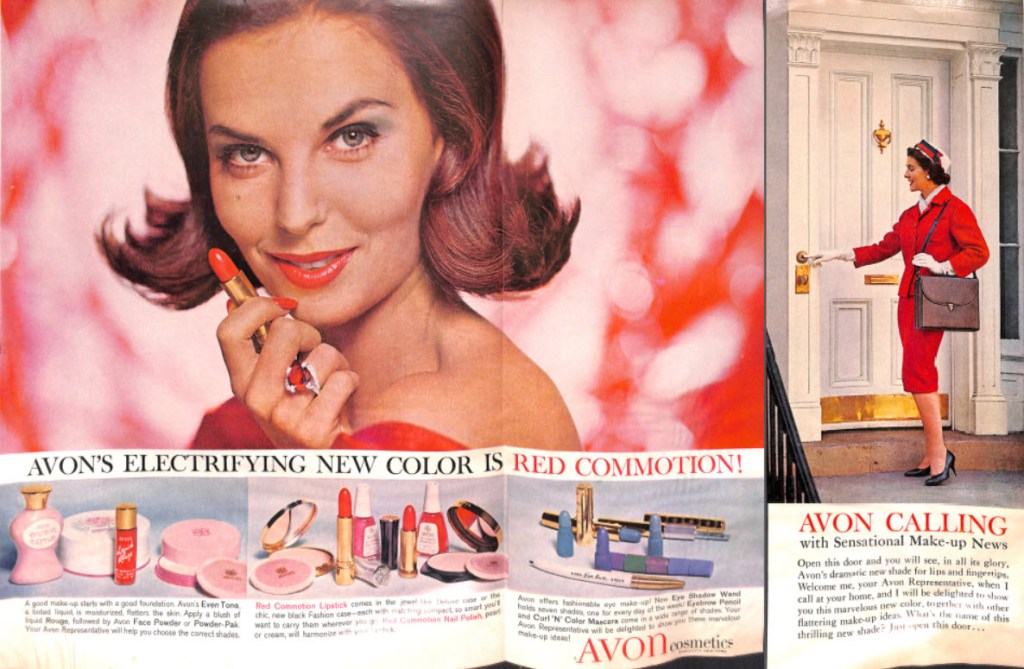 This 2 page ad from the May 1953 edition of Today’s Woman’s magazine talked of its team of Avon representatives who sold cosmetics directly to the customer in her home.