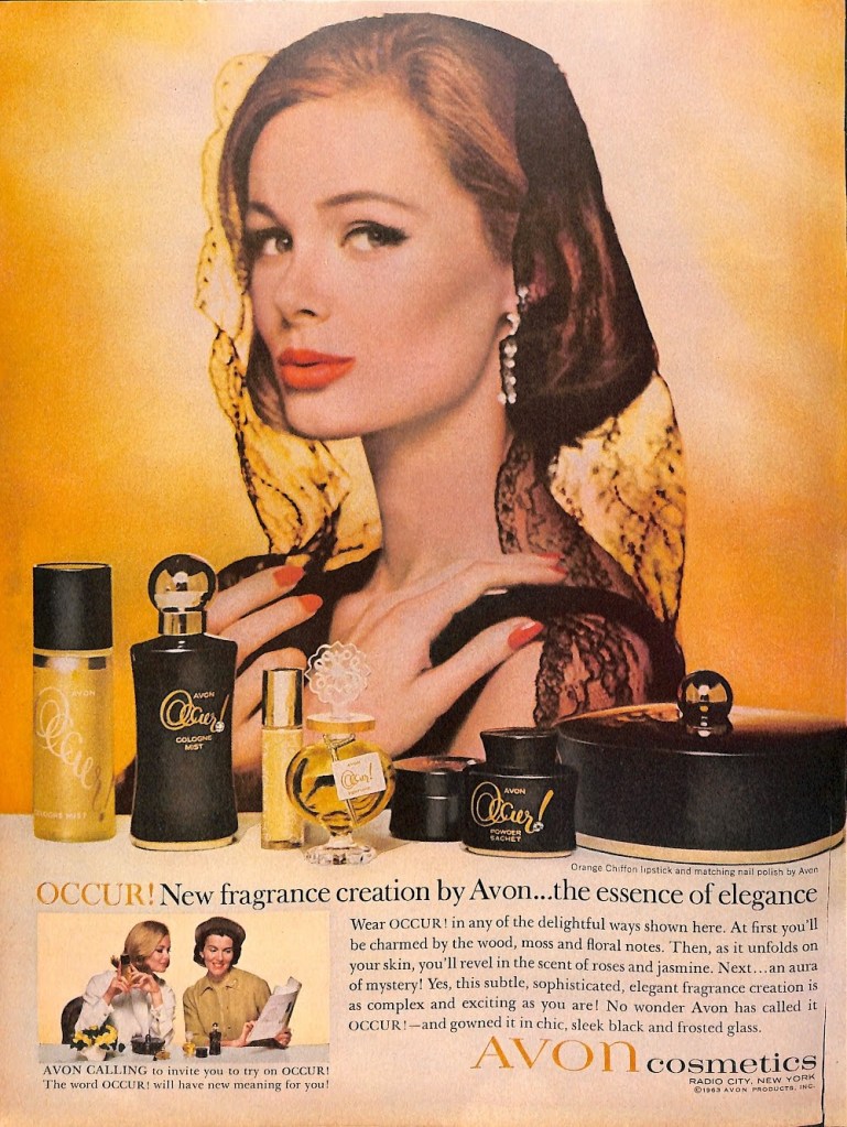 Unlike other beauty company advertisers, there was never a consistent look with Avon ads. Note the differences in the ads below from the 1950’s and 1960’s.