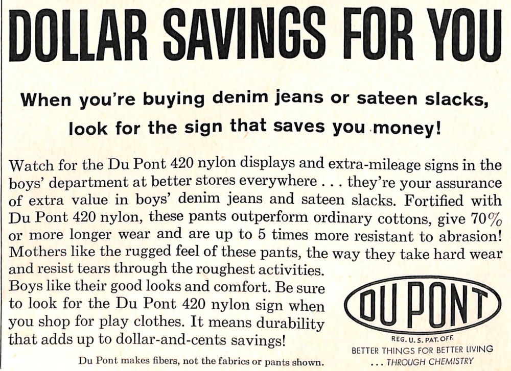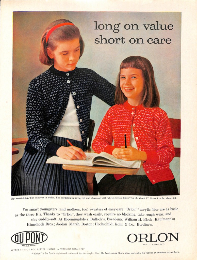 As we go through the alphabet of Great American mid-century brands, we come to the letter D and the giant company DuPont. Numerous DuPont ads are found in mid-century women’s magazines to educate readers about its manmade fibers used in clothing and nylon stockings. Here, they are showing mothers that their Orlon acrylic fiber is perfect for back-to-school sweaters.