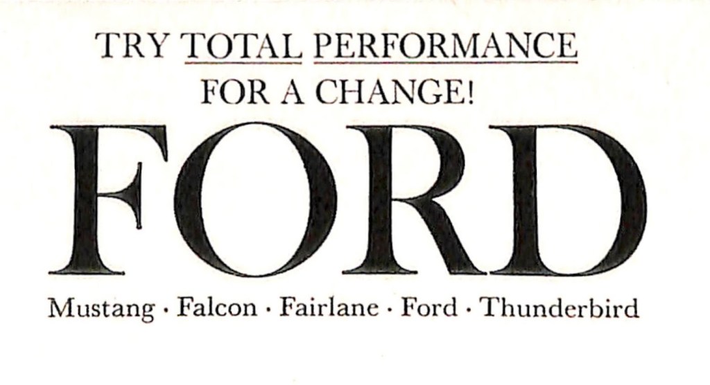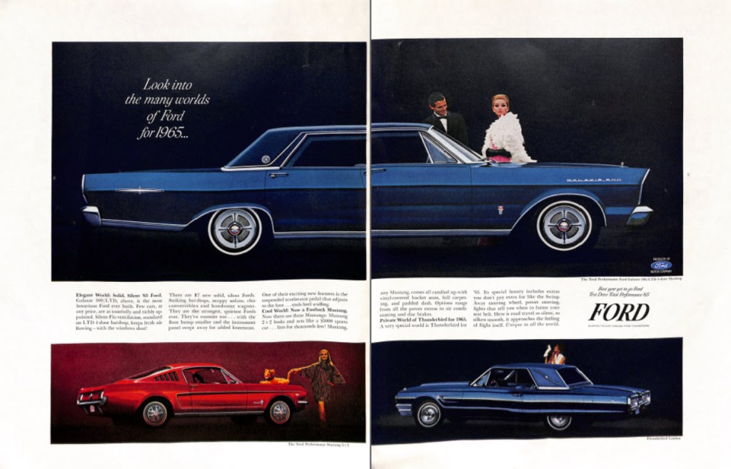 Here’s one more ad from later in the year. This one features the 1965 models of the Galaxie, the Mustang, and the Thunderbird.