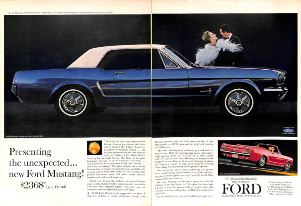You likely know that it was Henry Ford and his inexpensive mass produced Model T that allowed regular people to own a car early in the 20th century. As time moved on, the more cars sold, the more the world was changed. By the post-war mid-century, Ford and its competitors had made the American auto-industry into a giant success. As big players, go, Ford was one of the biggest. As classics go, the Ford Mustang is one of the most popular. So for today’s look at Great American brands, we will look at Ford Motors, the Mustang, and the year 1964.