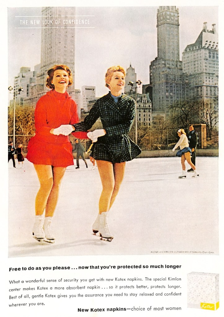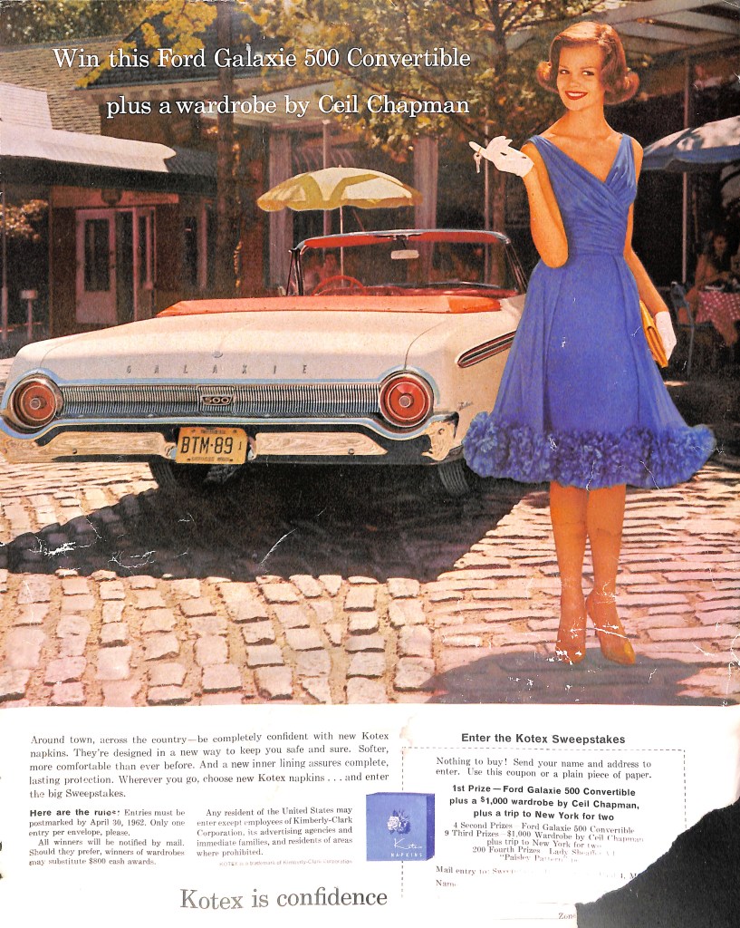 As was the case with other brands, things changed at the end of the century. The new look showed modern women independent from men. I have several Kotex ads from my collection from the late fifties and early sixties. Husbands, boyfriends, and admiring men were no longer portrayed. Instead, the vibe is independent, cool and confident.