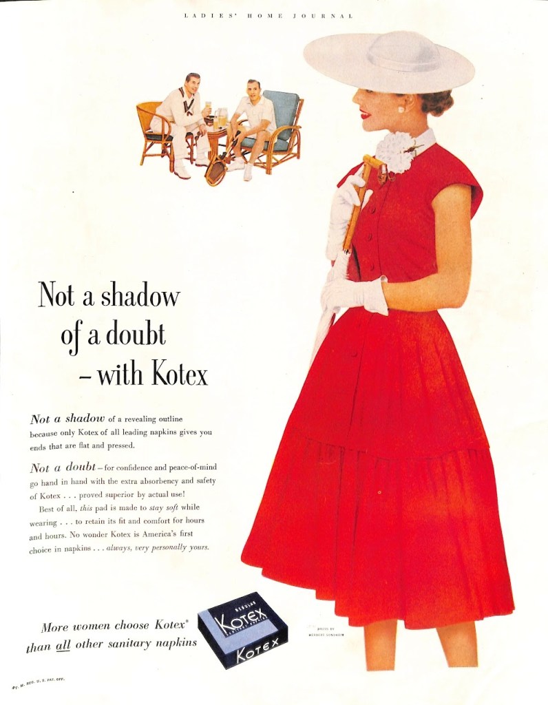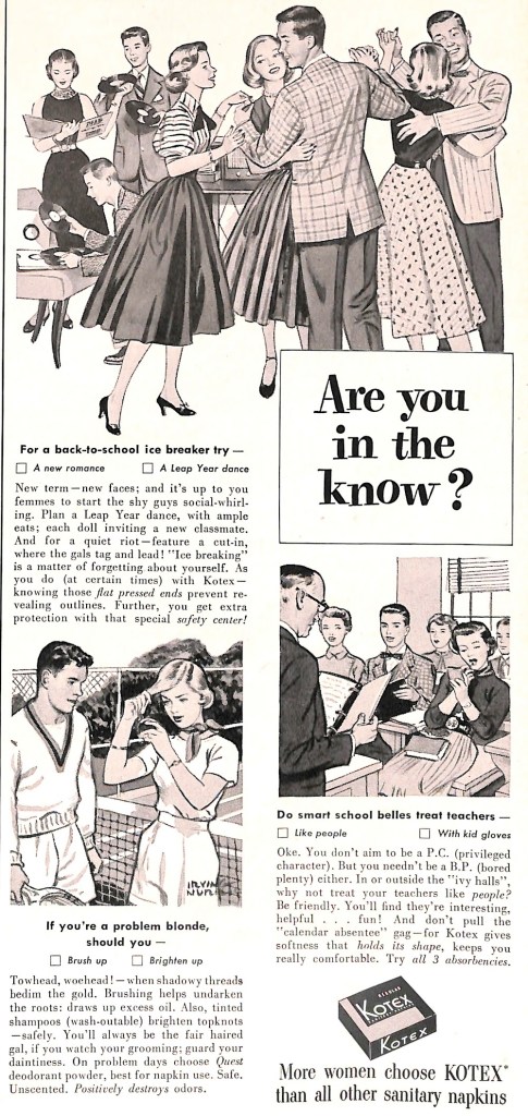 Of course, Kotex or a competing brand was a necessity for most readers of mid-century women’s magazines. If we assume that brand loyalty was a goal, what better way to establish trust than by giving the reader advice?