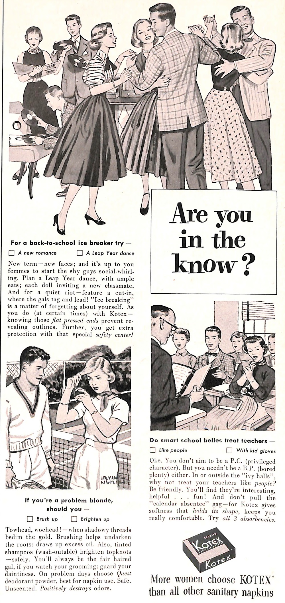 These wholesome looking partygoers are brought to us by Kotex. The ad appeared in the September 1952 edition of McCalls magazine as part of Kotex’s “Are You In The Know?” campaign. The brand and its advertising would change significantly as the decade progressed. This posting shows Kotex’s various ad campaigns through 1964.
