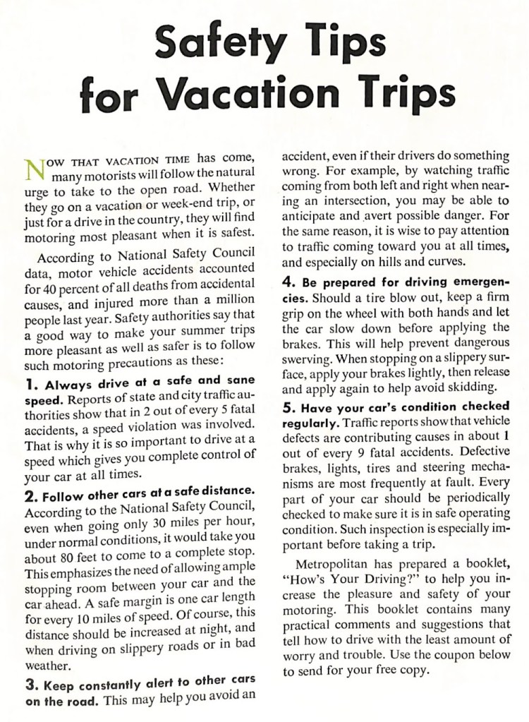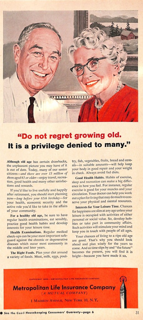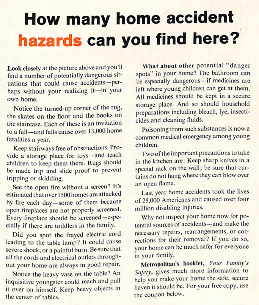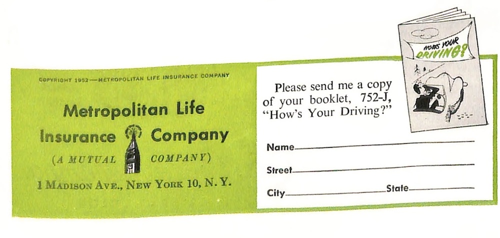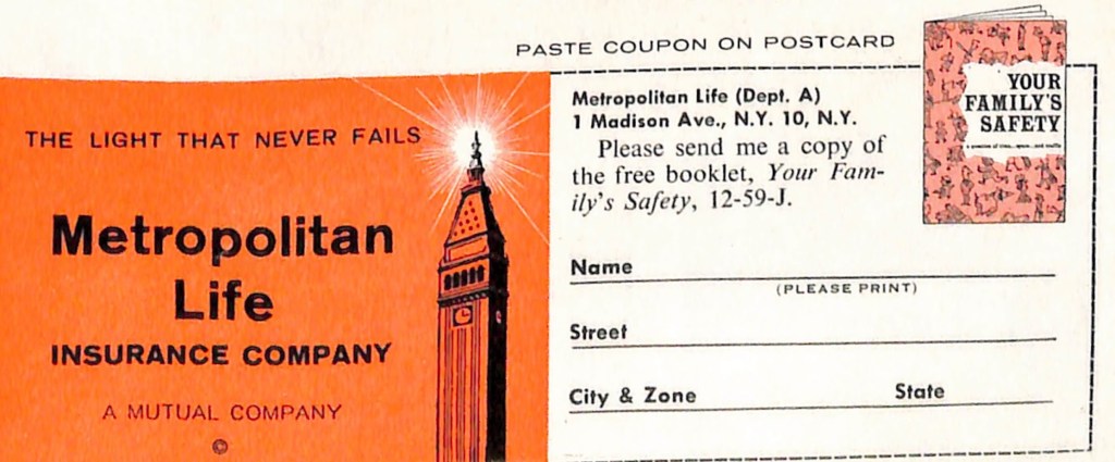 So far for MidCenturyPage.com’s series on American Business, we’ve covered Food, Industry, Technology, Health & Beauty, and Fashion. Today we’ll look at insurance–specifically Metropolitan Life Insurance company (currently known as MetLife). It might seem strange to think of Women’s magazines as a place to advertise insurance, but it was not unusual to see ads such as this one. Their approach was quite clever. Each of their ads contained an illustration showing something typical in one’s life. It went on to include text about a particular subject followed by a form to send in to get more information about that subject. What better way to establish brand trust and to connect with a brand?