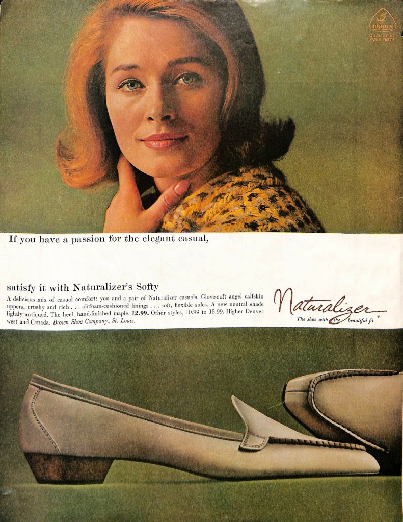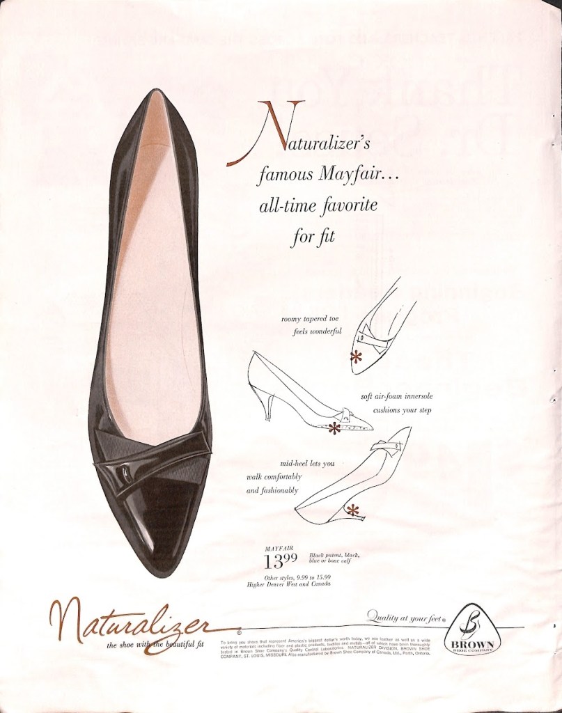 Today is Saturday, July 23rd and we are on our 23rd day of featuring mid-century American brands. We’ve covered a variety of companies relating to fashion. Hosiery, foundations, and swimwear were recent topics, but we haven’t covered the all important women’s shoe market. In an era before big name brands such as Nike or Skechers, there was a company named Brown Shoes and a brand named Naturalizer. This brand is near and dear to my heart because I have several of their wonderful shoes in my closet. I even worked in their retail store in recent years as a way to supplement my retirement income. It is my pleasure to show to you a few of their mid-century ads.