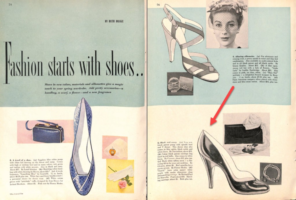 Someimes a mid-cenury girl wants something more than sensible shoes. Here’s an image from a 1952 article from the February 1952 edition of Redbook titled “Fashion Starts with Shoes”. This high-heeled patent leather shoe is featured in the article.