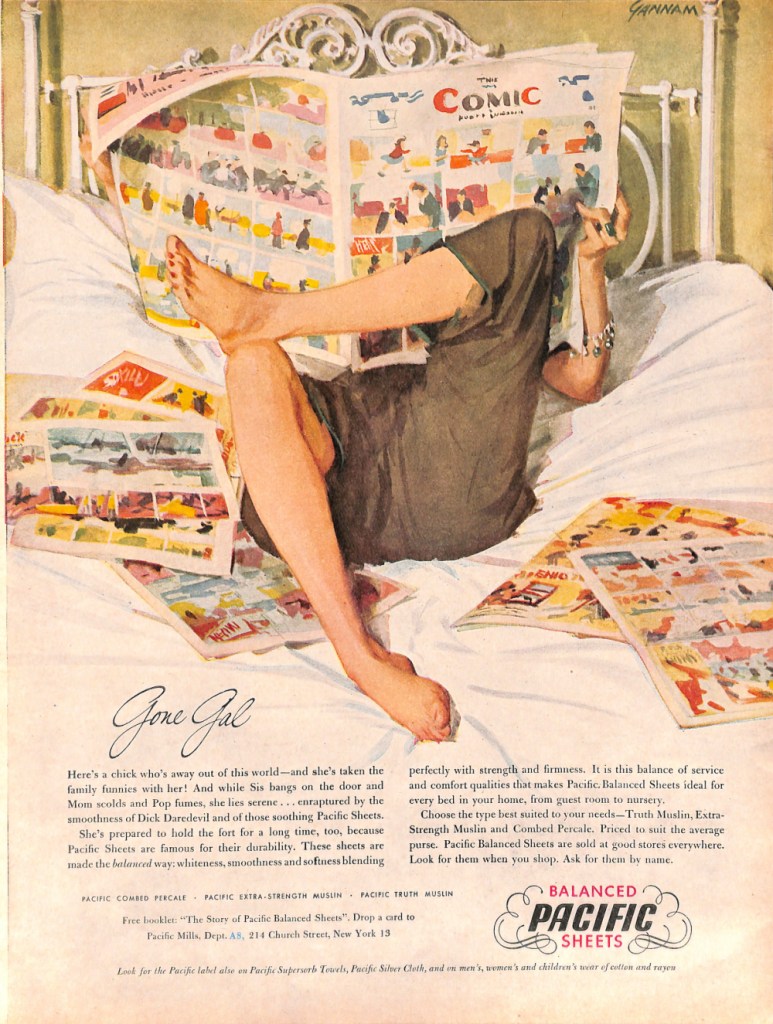 Here’s a chick who’s away out of this world-and she’s taken the family funnies with her! And while sis bangs on the door and mom scolds and pop fumes, she lies serene – – – enraptured by the smoothness of Dick Daredevil and of those soothing Pacific Sheets.