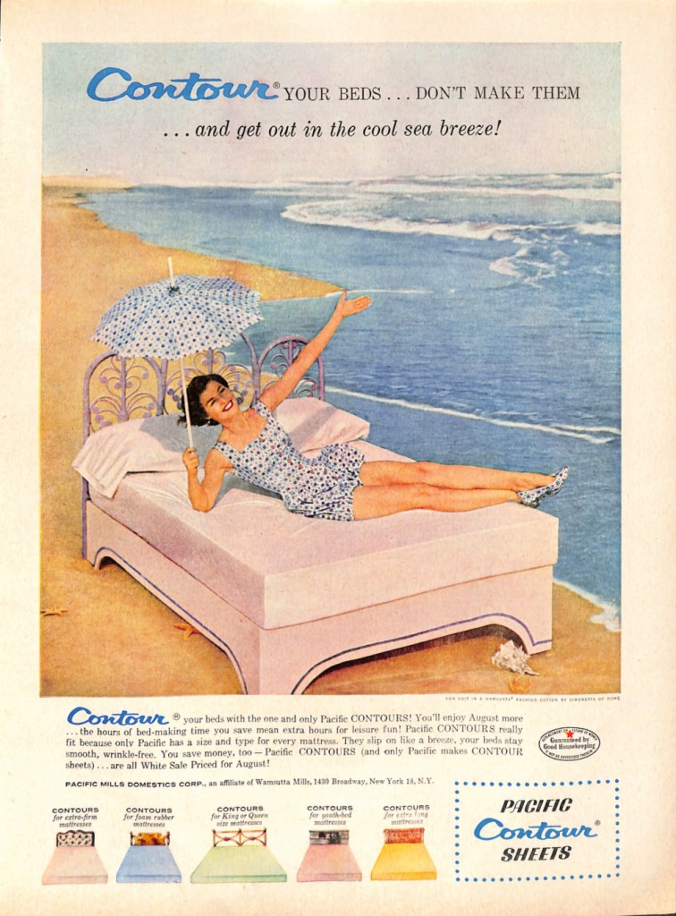 Here’s another Pacific Sheets ad from a bit later. It is advertising their Contour line which I am assuming is another name for fitted sheets. Funny to think that fitted sheets were a new concept in 1956 when the ad was published in the August edition of Good Housekeeping magazine.