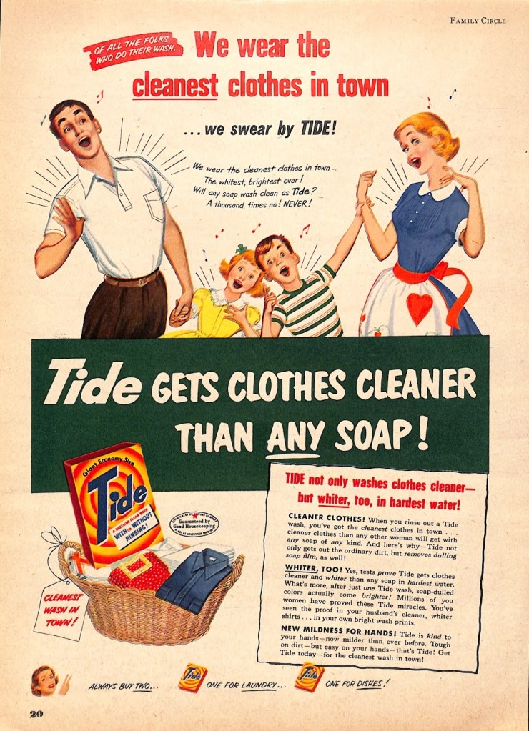 We wear the cleanest clothes in town – The whitest, brightest ever! Will any soap wash clean as Tide? A thousand times no! Never!