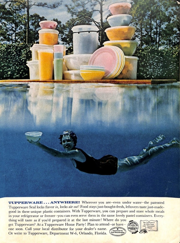 How fresh, how flavorsome everything stays in fine plastic containers by Tupperware! How differently, delightfully they’re sold! At home parties. Where you can see Tupperware’s exclusive features demonstrated before you buy.